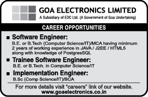 Goa Electronics Limited Recruitment 2017 | www.goaelectronics.co.in | Trainee Software Engineer | BCA/ B.Sc/ BE/ B.Tech/ MCA | Last Date: 15th September 2017